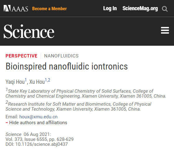2021年8月6日,我校化学化工学院和物理科学与技术学院的双聘教授侯旭团队在美国《科学》杂志上受邀发表了关于新兴的仿生纳流离子学在未来人工智能、脑机接口技术中具有巨大潜能的Perspective文章。文章以“Bioinspired Nanofluidic Iontronics”为题,重点介绍了近年来纳流离子学的发展历程,提出了仿生科学将成为纳流离子学发展的新趋势,并展望了仿生纳流离子学在人工智能、脑机接口、类脑智能与人机增强等跨学科交叉领域的广阔应用前景。