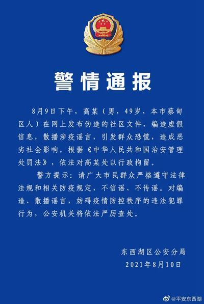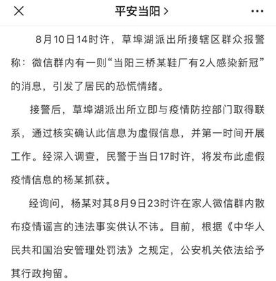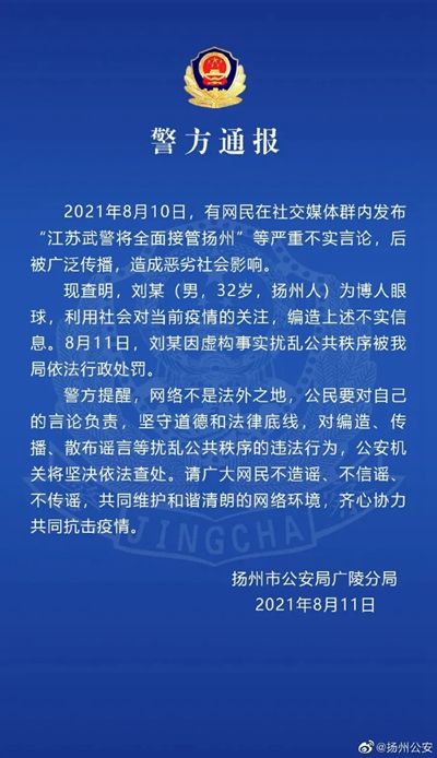 8月11日,江苏扬州警方通报一起疫情期间虚构事实扰乱公共秩序案件,一32岁男子受到行政处罚。