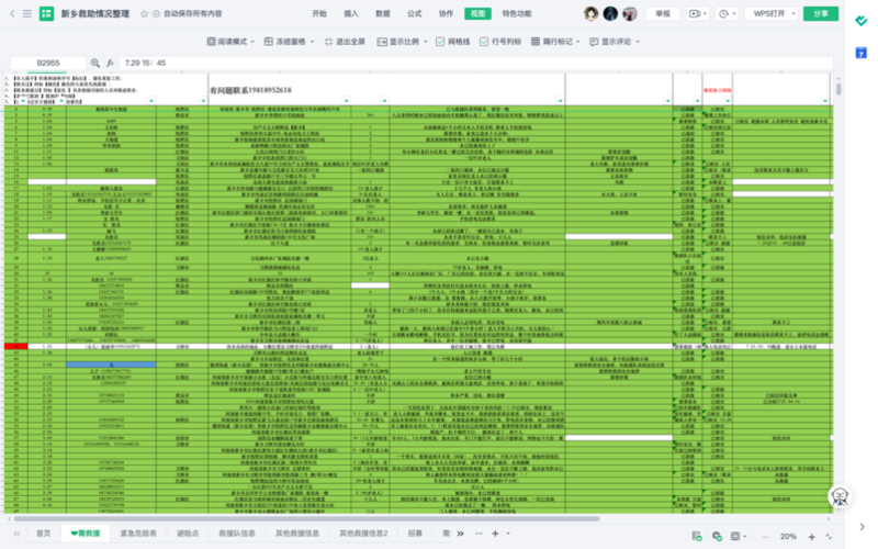 杜一诺(化名)创建的“新乡救助信息核实群”设立了不同的文档整理规则,志愿者通过不同颜色区别不同状态下的信息,例如已接手的案例编号标红,避免重复工作;核实过的信息标橘,联系救援后信息标蓝;人员脱困后,信息标绿。截至7月29日中午,文档内共汇入5435条求助信息。