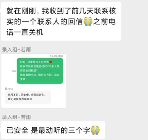 虽无法亲临前线,但隔着遥遥的距离和手机屏幕,他们开始搜集来自各个网络平台的河南求助信息,一一致电或短信核实,并对接官方或民间的救援人员。有时,他们还会再联系求助者回访,确定他们是否平安。在姚海文看来,线上志愿者“像传递奥运火炬一样,将信息从求助者那里传递到救援人员手中”,虽无法亲身进入现场,却发挥着关键性的作用。