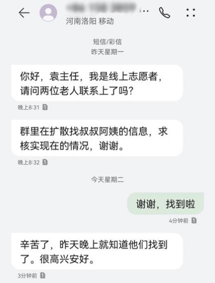 出乎意料的是,她的这条求助信息被传到各个平台,在多个线上志愿者信息搜集群中来回辗转。给她发送短信询问情况的陌生号码来自全国各地:河南新乡、郑州、许昌、洛阳,北京,广州,云南,重庆……直到父母被成功找回后,短信依旧没停。
