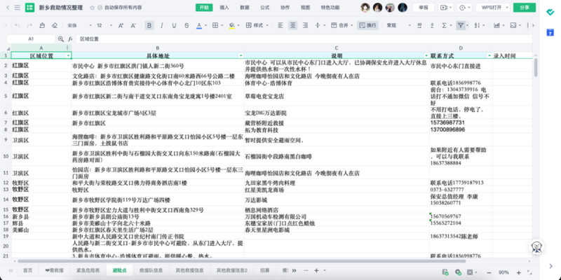 除“需救援”表格外,总表内还包括“避险点”“救援队信息”“物资需求”、“救援队求助”等表格,留存了数十支民间救援队的联系方式,以及许多线下民间志愿者的所提供的帮助: “107国道旁,毛滩村下口,有1000吨干沙土,1000个沙袋,10多名人员,装载机2台,另可安置200人伙食”……
