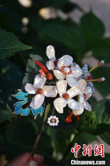 他最喜欢的一支绣球花簪子,点翠工艺的底胎、花丝镶嵌工艺的叶子、辑珠工艺的蝴蝶,再加上串联珍珠、南红珠和老翡翠,都是手艺活儿。