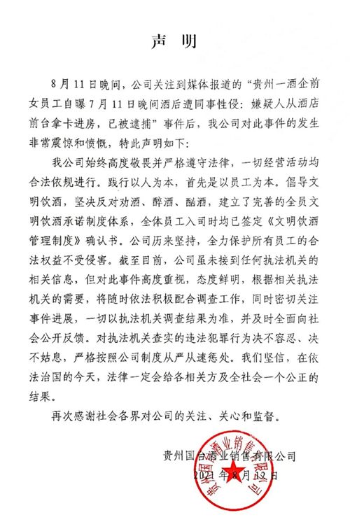 8月13日,澎湃新闻注意到,贵州国台酒业股份有限公司微信公众号发布声明,称对此事件高度重视,将随时依法积极配合调查工作,并及时全面向社会公开反馈。