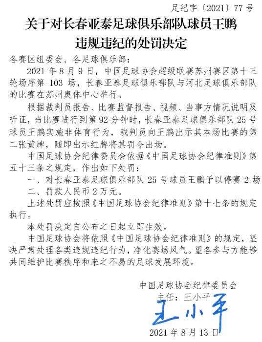 最终,中国足协决定给予张呈栋停赛5场罚款5万元的处罚,王鹏则遭停赛2场罚款2万元。