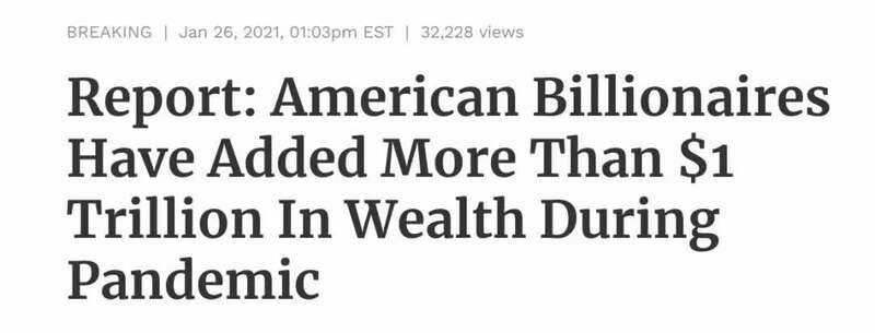从2020年3月到2021年1月,600多名美国亿万富翁的财富总额增长幅度达38.6%。图源:外媒