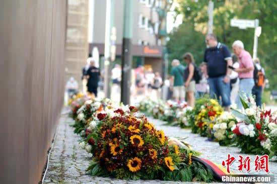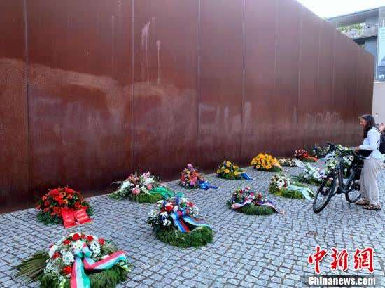 图为柏林墙遗址纪念公园内摆放的用于纪念因试图穿越柏林墙而死去的人的花束。