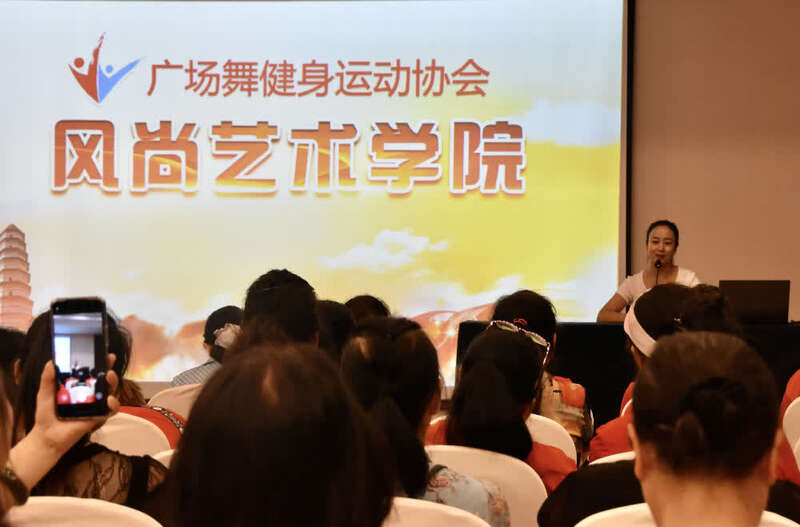 吴艳(台上)在给全国各地舞团团长讲授健身腰鼓基本要领