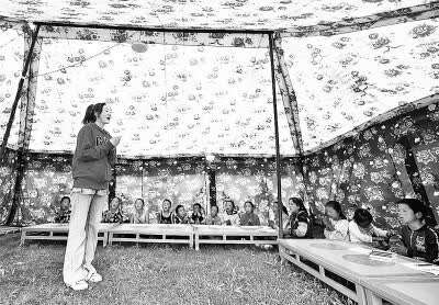 暑假,青海果洛藏族自治州玛沁县下大武乡年扎村的“育苗加油站”,大学生教孩子们唱歌。新华社发