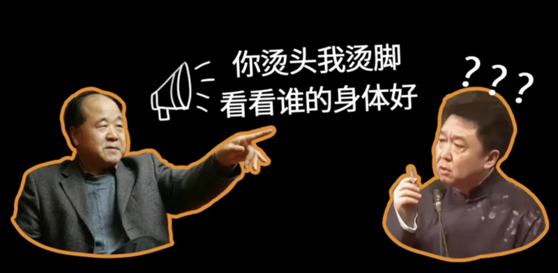 莫言:烫头的一个先决条件是要有茂密的头发,我头发这么稀稀落落的,要烫得话就只能烫头皮了。后来我一想不对,网友说烫头肯定不指的是烫发?幸好现在有这么便利的搜索条件,一搜索我才知道,原来是这样一个梗,就是于谦的三大爱好:抽烟喝酒烫头。让他去烫头吧,他头发多。如果再加一个爱好的话,那我就烫脚,你烫头我烫脚,看看谁的身体好。