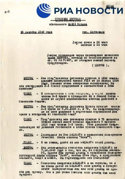 这些文件中还有苏联对最后一任日本关东军司令山田乙三的审讯笔录,其本人亲口承认了731部队用这些人进行过人体试验。