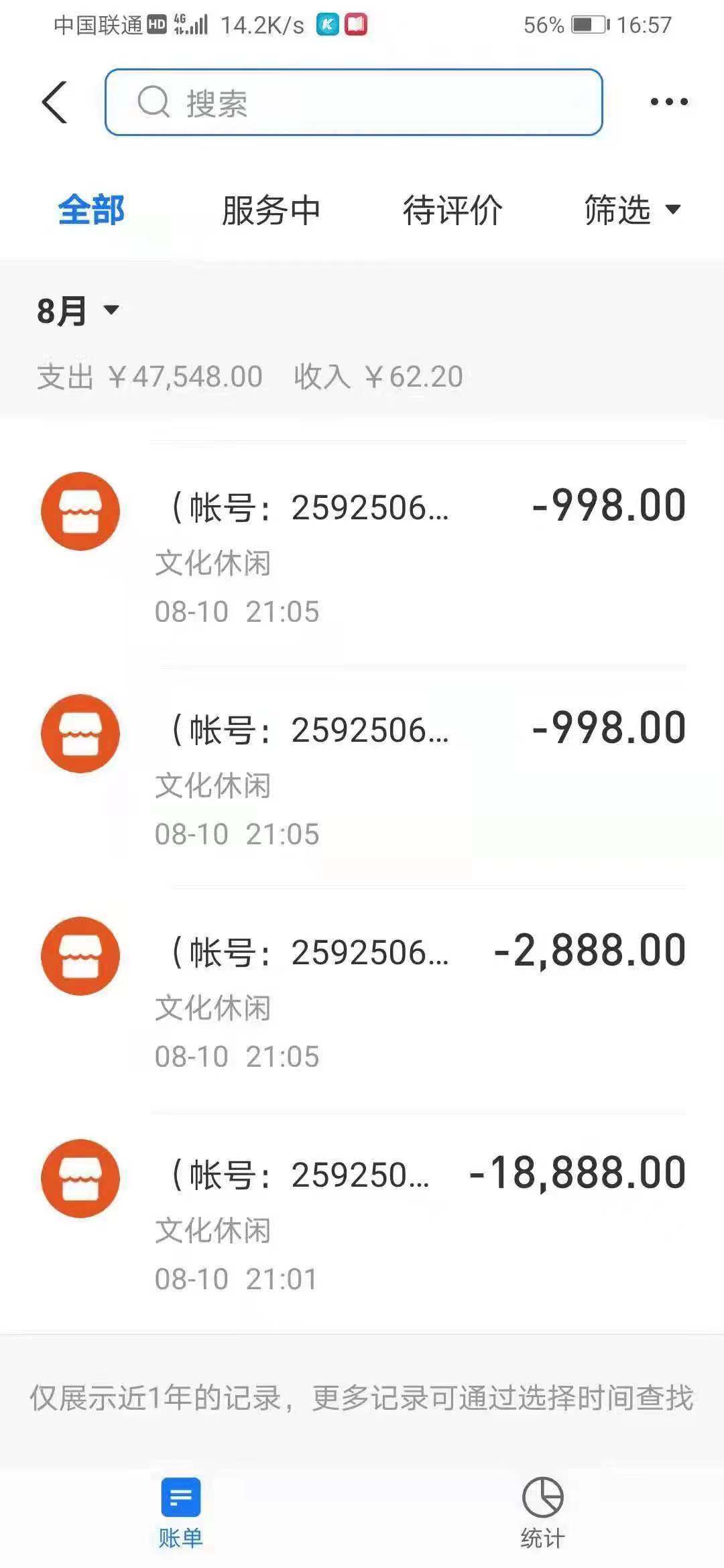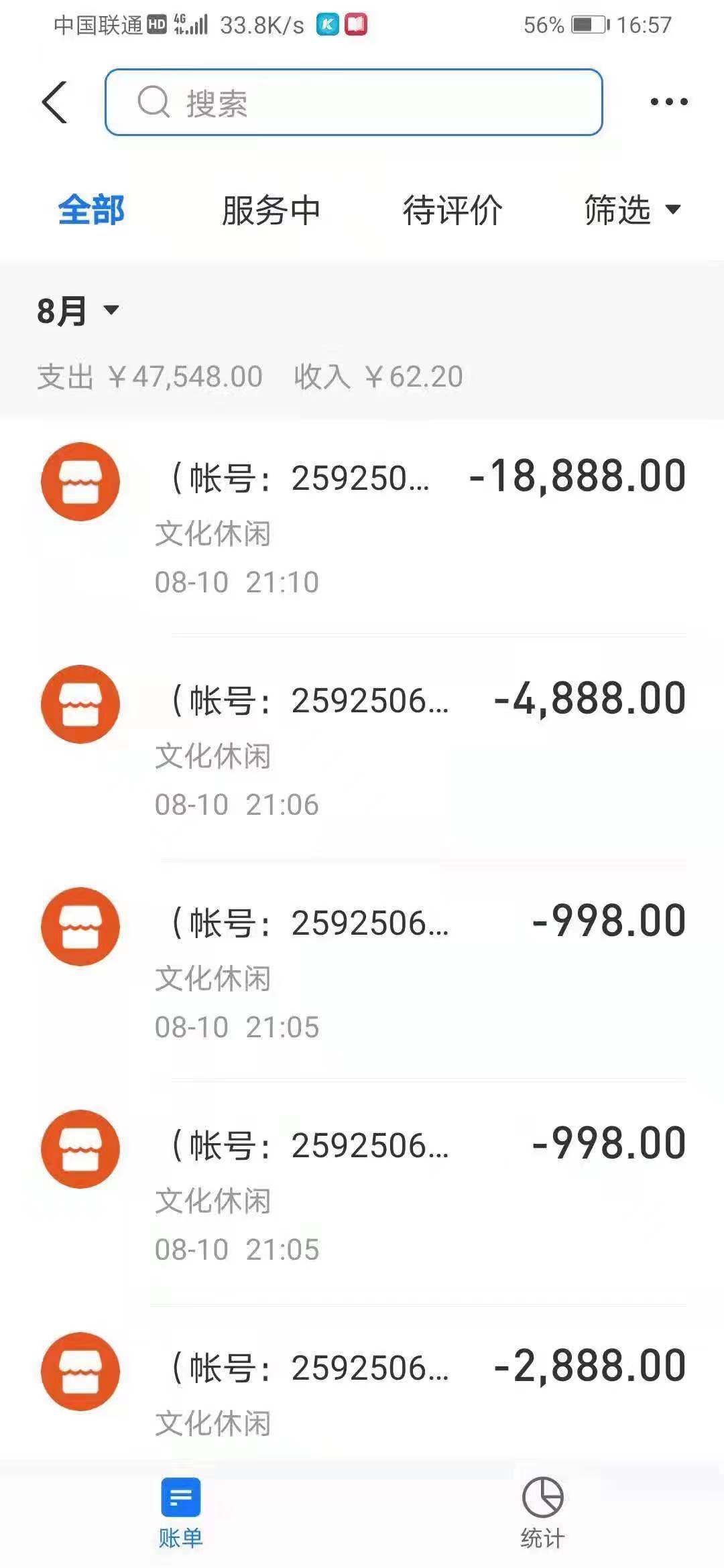 然而,短短几分钟后,蒋先生发现支付宝账户上的钱被分多次转走了共计5万多元。蒋先生提供的账单详情显示,自8月10日21时05分至10分,蒋先生一共有9笔支出,商品说明均为“(账号:2592506844)充值钻石”。