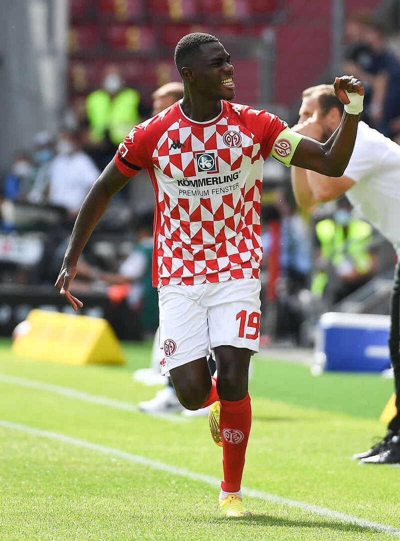 8月15日,美因茨队球员尼亚凯特在比赛中进球后庆祝。新华社发