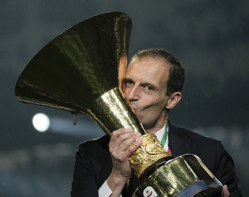 资料图:2021年5月19日,尤文图斯队主教练阿莱格里亲吻奖杯。在2018-2019赛季意大利足球甲级联赛第37轮比赛中,尤文图斯队主场以1比1战平亚特兰大队。赛后举行了本赛季意甲冠军颁奖仪式。新华社发(奥古斯托·卡萨索利摄)