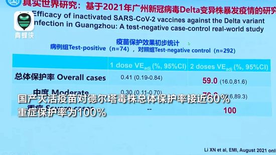 不久前的广州疫情中,共有153人感染德尔塔毒株。钟南山介绍,通过对接种国产疫苗患者与未接种患者的对比,发现国产灭活疫苗对德尔塔毒株有保护作用,总体保护率接近60%,对中度症状保护率为70%,对重症病人的保护率则达到了100%。这项研究近几天刚刚在期刊《新发微生物与感染》(Emerging Microbes Infections)上发表。