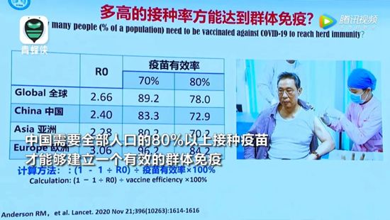 中国要达到怎样的疫苗接种水平才能实现“群体免疫”?钟南山表示,这与疫苗的有效率相关,还要看病毒的传播系数。“中国疫苗的有效率大概是70%左右,那么中国需要全部人口的80%以上接种疫苗,才能够建立一个有效的群体免疫。现在,中国的疫苗接种率大概到今年年底可以达到80%以上。”