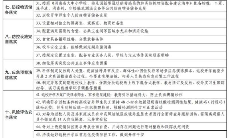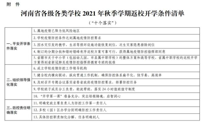 做好开学工作,河南要求把握安全原则,提出“六个不得开学”,即:学校仍属中高风险区的不得开学,疫情防控条件达不到当地疫情防控要求的不得开学,不能满足防控技术方案要求的不得开学,没有完善应急预案且没有开展应急演练的不得开学,防疫物资储备不到位的不得开学,灾后校舍安全没有保证的不得开学。