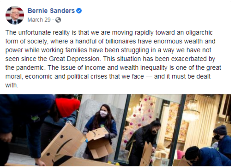 对此,美国无党派联邦参议员伯尼·桑德斯曾撰文称,贫富不均是美国面临的重大道德、经济和政治危机。“我们正迅速走向寡头政治,少数亿万富豪拥有巨大的财富和权力,而工薪家庭却在以自大萧条以来从未见过的方式挣扎。”