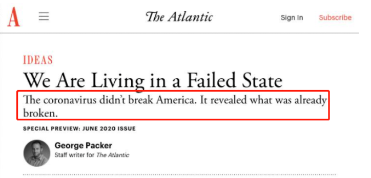 正如《大西洋月刊》早前刊文指出的那样,“我们生活在一个失败的国家”,“新冠病毒没有撕裂美国,只是暴露了美国已有的撕裂”。