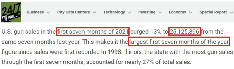 美媒发布的最新数据显示,今年仅前7个月,美国枪支销量就已超过2500万支,创下1998年有记录以来的同期最大销量。