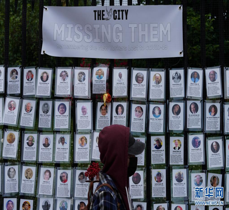 6月14日,行人从美国纽约一处墓地外为新冠死者设立的纪念装置旁走过。新华社记者王迎摄