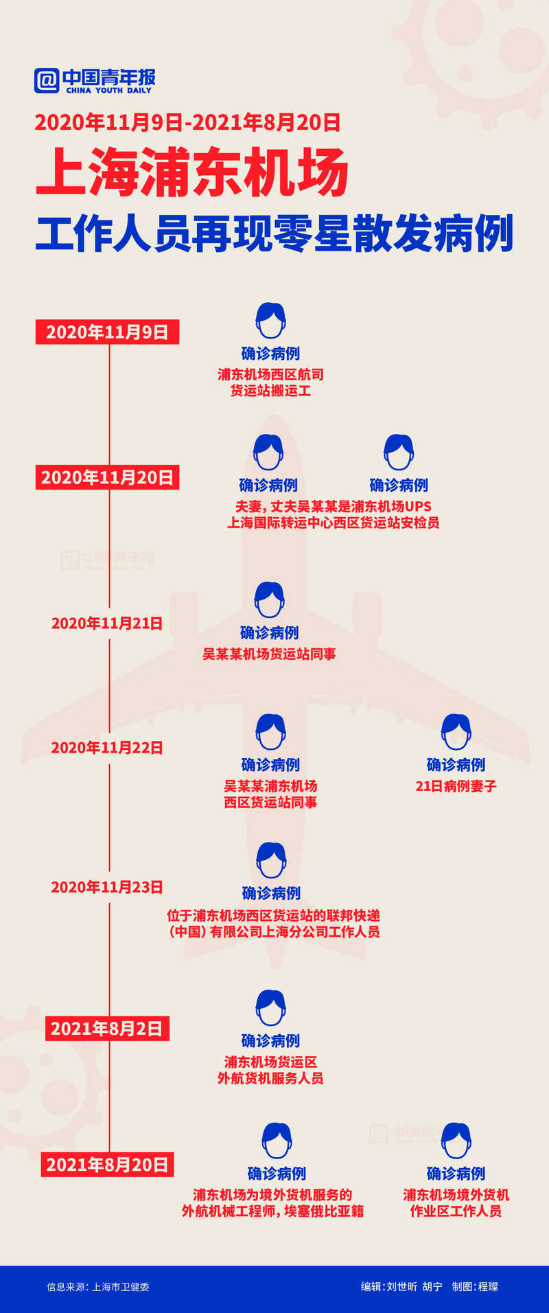 8月20日,上海报告新增两例本土新冠肺炎确诊病例,二人在浦东机场境外货机作业区工作,例行核酸检测中发现异常。记者梳理发现,自2020年年底以来,上海浦东机场货运区的工作人员已4次报告出现零星散发病例。截至2021年8月20日,累计共有10人确诊,均为国际货运站相关工作人员及其亲属,以及在货运站内工作的快递员等。