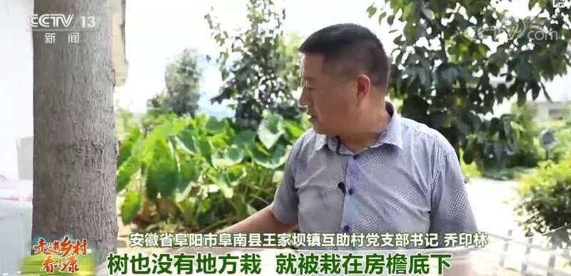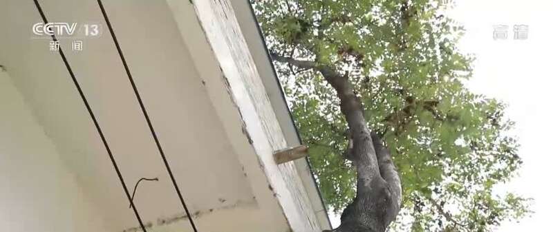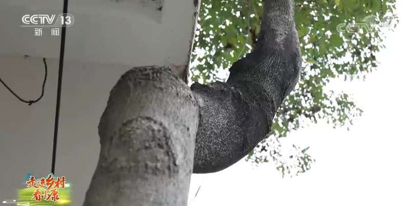 安徽省阜阳市阜南县王家坝镇互助村党支部书记 乔印林:这个树生长在房檐下非常艰难。(过去)庄台上因为居住拥挤,人没有地方住,都是一排挨着一排的房子。树也没有地方栽,就被栽在房檐底下。上面因为是房檐了,只有在缝隙中(拐弯生长)。