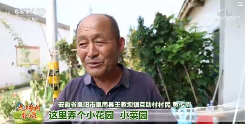 安徽省阜阳市阜南县王家坝镇互助村村民 黄传周:现在改造得我们喝凉水都高兴。为啥呢?现在空气也好了,人走路也好了,啥都方便了。这里弄个小花园、小菜园,连果树都有了。
