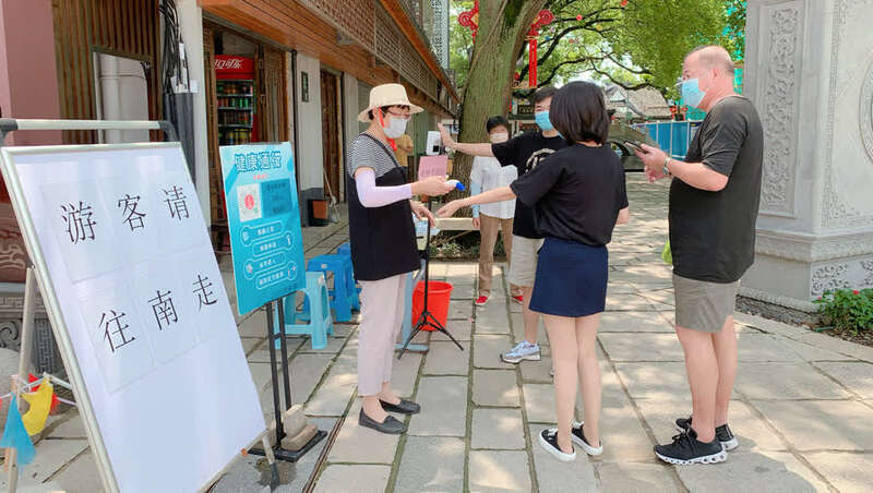近期,位于奉贤区的上海青溪老街的游客络绎不绝。青溪老街今年五一前后正式对外开放,自此变成了一个集居民居住、游客游览、商铺营业的多功能开放式街区。为了严格执行防疫措施,居委会每日安排志愿者守住两个停车场和三个专供游客进出的路口,并采购了更高效的“刷脸”测温仪,确保测温和验码无一遗漏。