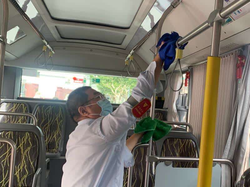 8月22日中午,在普陀区大渡河路桃浦路终点站,公交136路驾驶员吴明在停站间隙,对车辆的扶手、座椅、拉手环、车窗开关把手等乘客密切接触区域进行消毒。“这块蓝色抹布专门擦灰尘,绿色抹布蘸了消毒液,用来消毒作业。两块抹布分开使用,避免二次污染。”