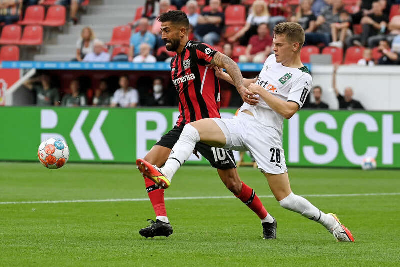 8月21日,勒沃库森队球员德米尔巴伊(左)在比赛中与门兴格拉德巴赫队球员金特尔拼抢。新华社发(乌尔里希·胡夫纳格尔摄)