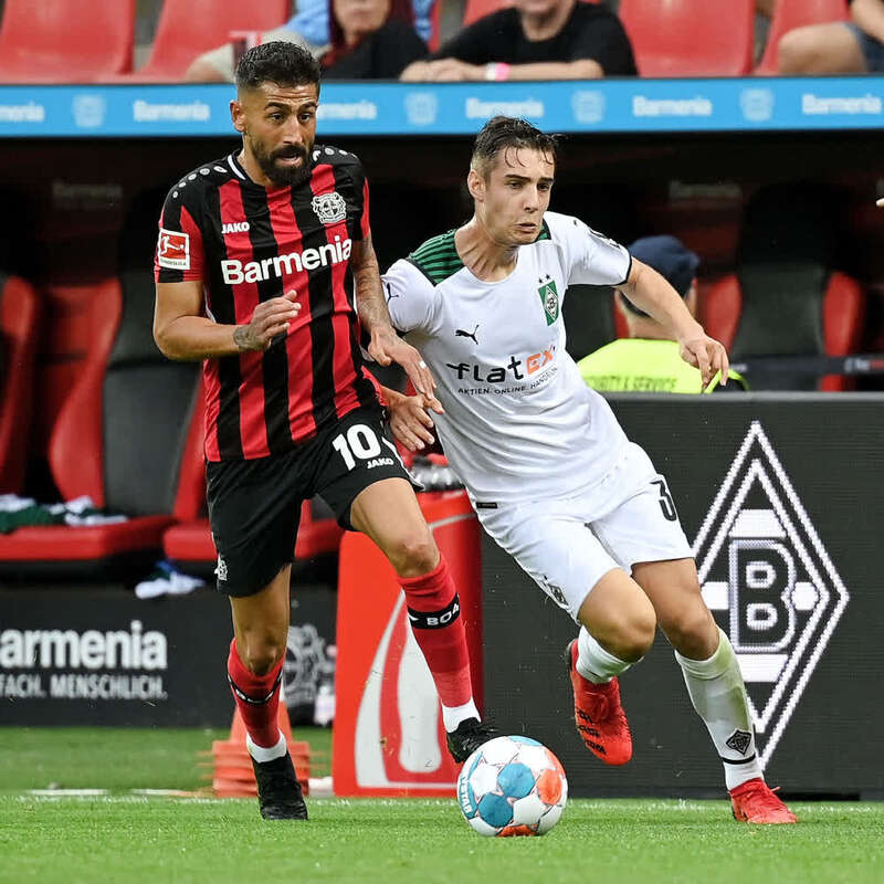 8月21日,勒沃库森队球员德米尔巴伊(左)在比赛中与门兴格拉德巴赫队球员诺伊豪斯拼抢。新华社发(乌尔里希·胡夫纳格尔摄)