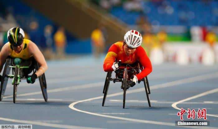 资料图:2016年巴西里约,2016里约残奥会首日,T54女子轮椅100米赛,中国选手黄丽莎夺冠。