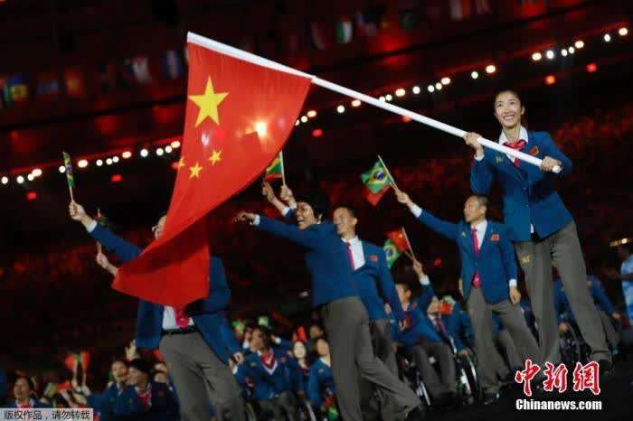 资料图:2016年,第十五届夏季残疾人奥林匹克运动会开幕式在巴西里约热内卢马拉卡纳体育场举行。图为中国代表团入场,担任旗手的是击剑冠军荣静。
