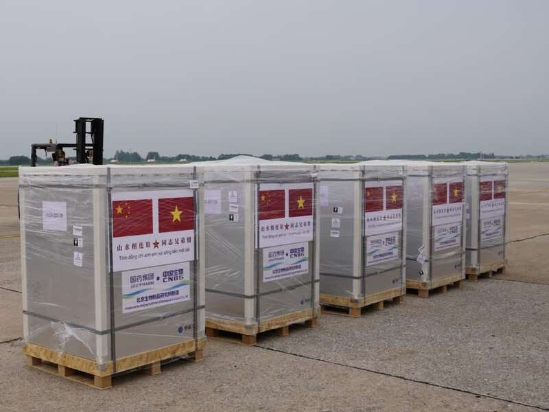 8月23日上午,中国人民解放军向越南军队援助的一批新冠疫苗运抵越南河内内排机场。中国驻越南大使熊波和越共中央委员、越南国防部副部长黄春战出席了在内排机场举行的疫苗交接仪式,中国驻越南使馆国防武官潘涛、政务参赞陈虹及越南外交部部长助理阮明姮等参加。