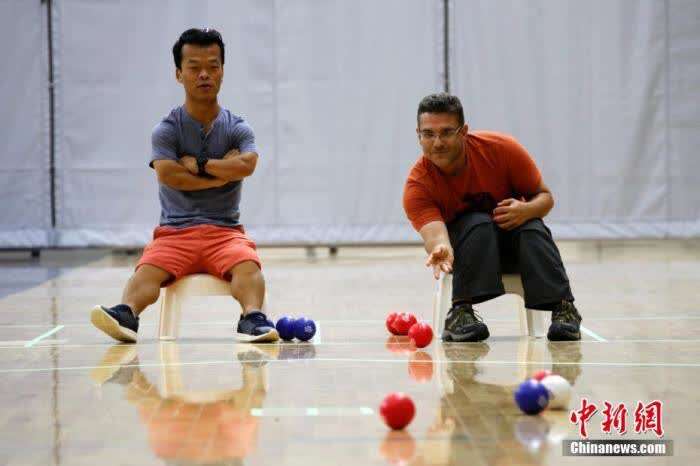 资料图:两名运动员在比赛间歇进行室内硬地滚球练习。 中新社记者 余瑞冬 摄