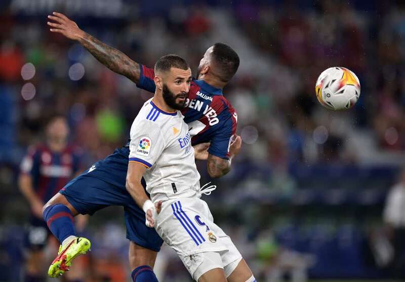 8月22日,皇家马德里队球员本泽马(前)和莱万特队球员韦佐在比赛中争顶。