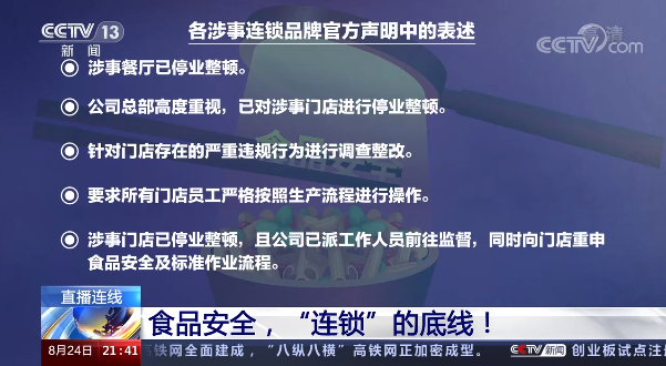 中国人民大学法学院副院长 王旭:应该说从类似措辞和表述来看,确实给人有切割的印象,但是这种切割在法律上来看,还是有很大的风险,也是不能够成立的。因为《食品安全法》通过专章规定了企业是第一责任人。他们是在共同的品牌和共同经营环境里的一个共同体。所以作为企业,它在共享一个品牌对于它的加盟店或者分店,进行管理、规制的过程中,实际上是履行自身企业的法律责任的一种表现,而不是将自己置身事外,作为高高在上的一种姿态去指责它的同行,我想这两个逻辑是不可以混淆的。