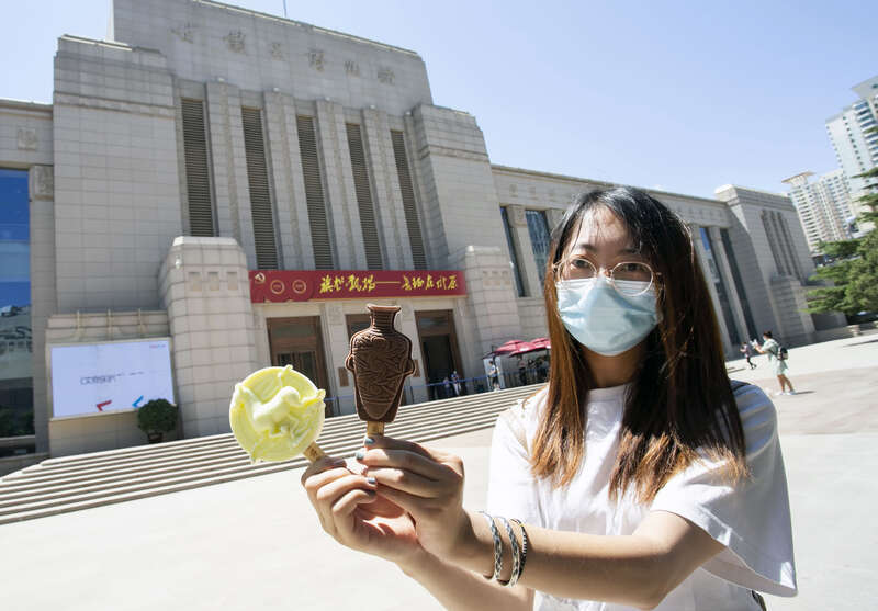 2021年7月30日,甘肃兰州,游客手拿“铜奔马”“彩陶瓶”造型的雪糕,在甘肃省博物馆前拍照打卡。视觉中国/供图