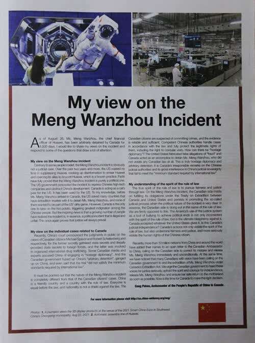 2021年8月25日,驻加拿大大使丛培武在加拿大主流媒体《国会山时报》发表题为《如何看孟晚舟事件》的署名文章。全文如下: