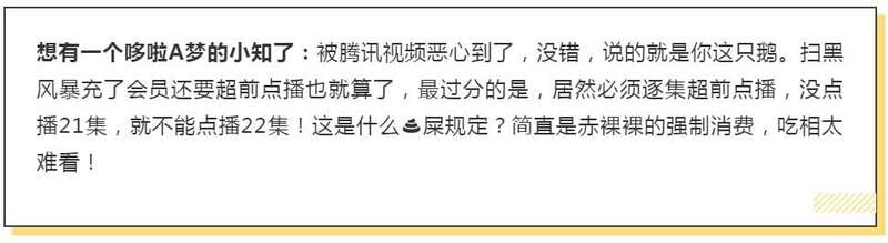 想有一个哆啦A梦的小知了:被腾讯视频恶心到了,没错,说的就是你这只鹅。扫黑风暴充了会员还要超前点播也就算了,最过分的是,居然必须逐集超前点播,没点播21集,就不能点播22集!这是什么屎规定?简直是赤裸裸的强制消费,吃相太难看!