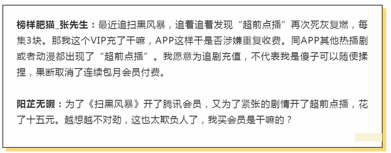 榜样肥猫_张先生:最近追扫黑风暴,追着追着发现“超前点播”再次死灰复燃,每集3块。那我这个VIP充了干嘛,APP这样干是否涉嫌重复收费。同APP其他热播剧或者动漫都出现了“超前点播”。我愿意为追剧充值,不代表我是傻子可以随便揉捏,果断取消了连续包月会员付费。