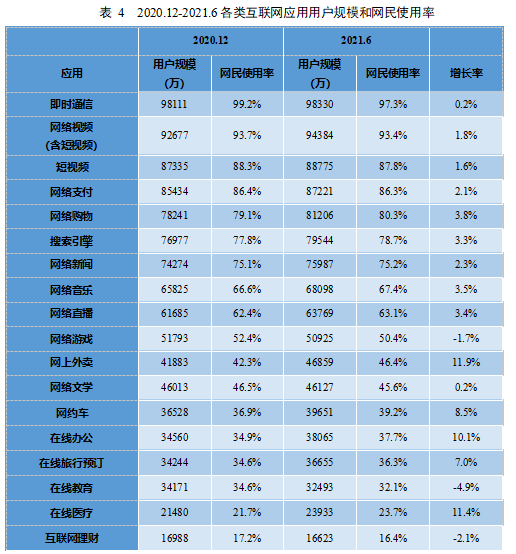 此外,报告显示,截至2021年6月,我国网民的人均每周上网时长为26.9个小时,较2020年12月提升0.7个小时。