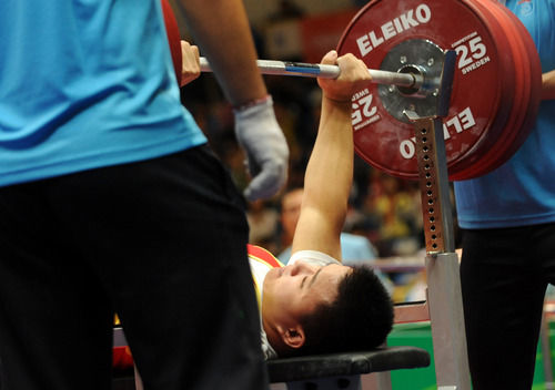 资料图:2011年10月13日,第八届全国残疾人运动会,山东选手刘磊在比赛中试举。新华社记者韩传号摄