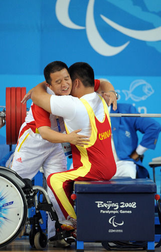 资料图:2008年9月14日,刘磊在2008年北京残奥会男子75公斤级试举成功后与教练拥抱。新华社记者杨磊摄