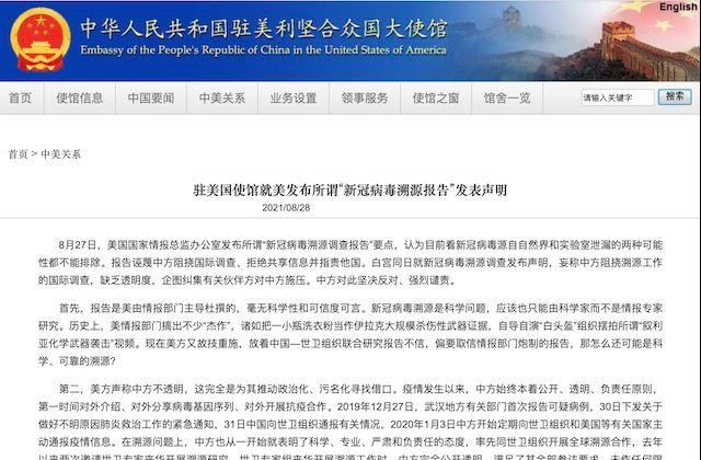 我驻美使馆:美所谓“新冠病毒溯源报告”毫无科学性和可信度可言