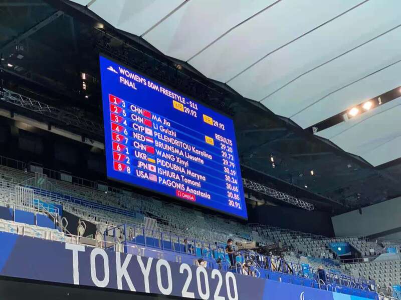 8月29日晚,东京残奥会女子50米自由泳S11级决赛重赛的比赛结果,中国选手继续包揽冠亚军。中国残联供图