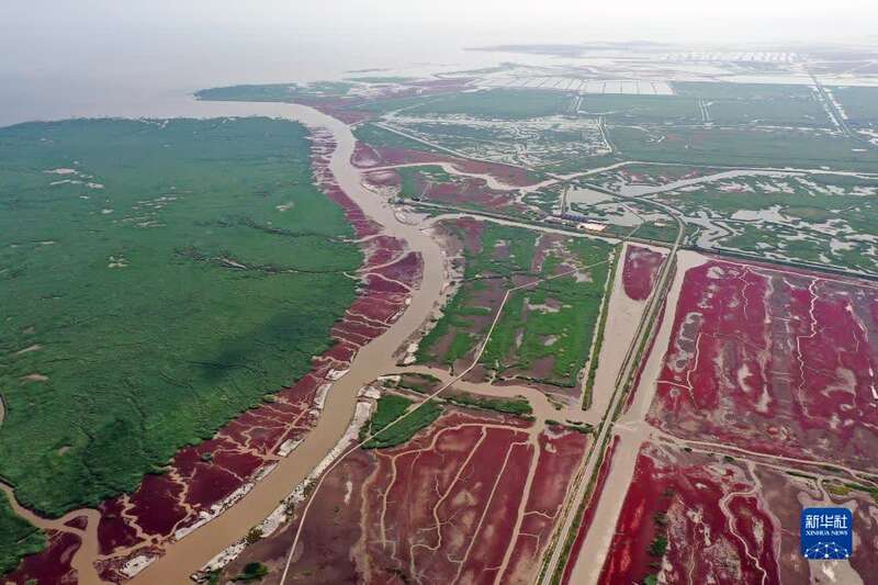 这是8月19日拍摄的辽河入海口旁特有的红海滩(无人机照片)。新华社记者 姚剑锋 摄