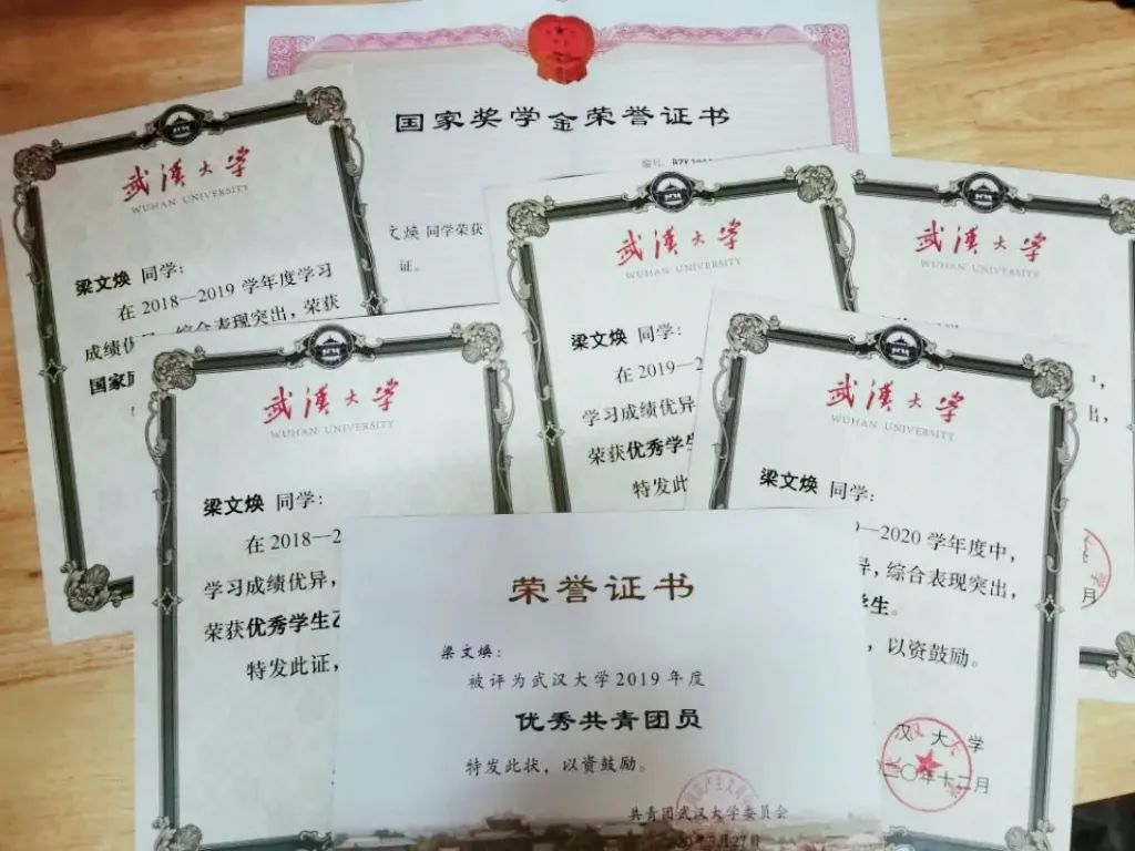 大学期间,梁文焕不仅专业保持着 优异成绩,也取得了甲等优秀学生奖学金、国家奖学金、武汉大学“自强之星”等荣誉。面对各式各样的考试、比赛,梁文焕有着自己的独到见解:考核是激励,真正重要的在于是否在准备的过程中有所收获 。