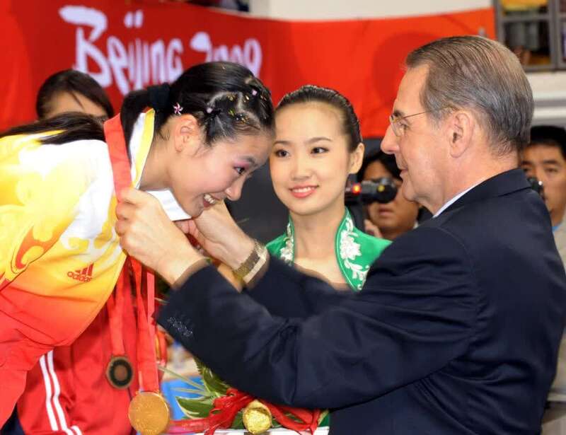 资料图:2008年8月22日,罗格(右)为2008北京奥运会武术比赛女子剑枪术全能套路赛冠军中国选手马灵娟颁发金牌。新华社记者刘力航摄